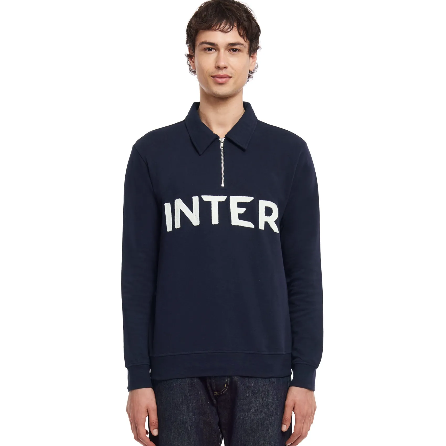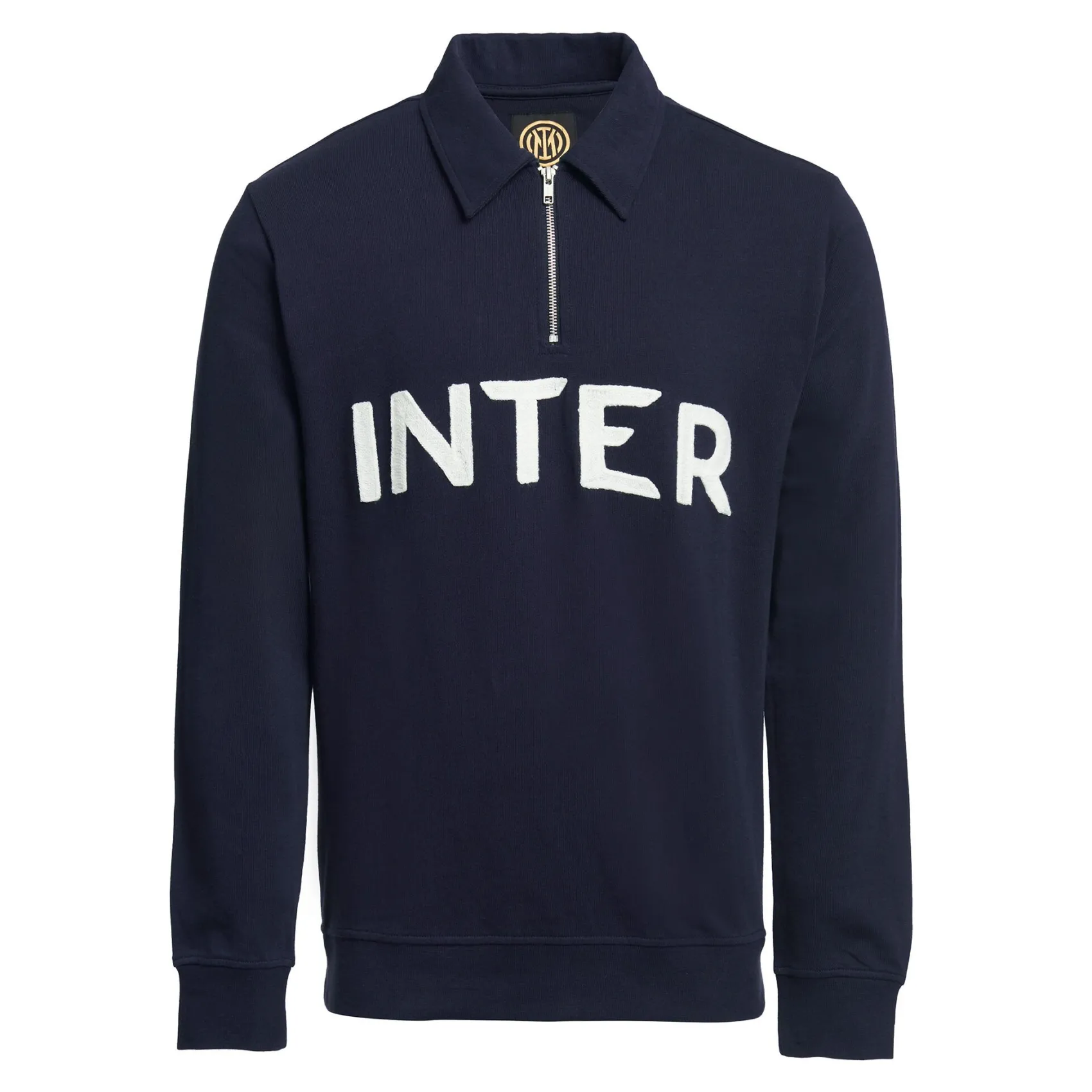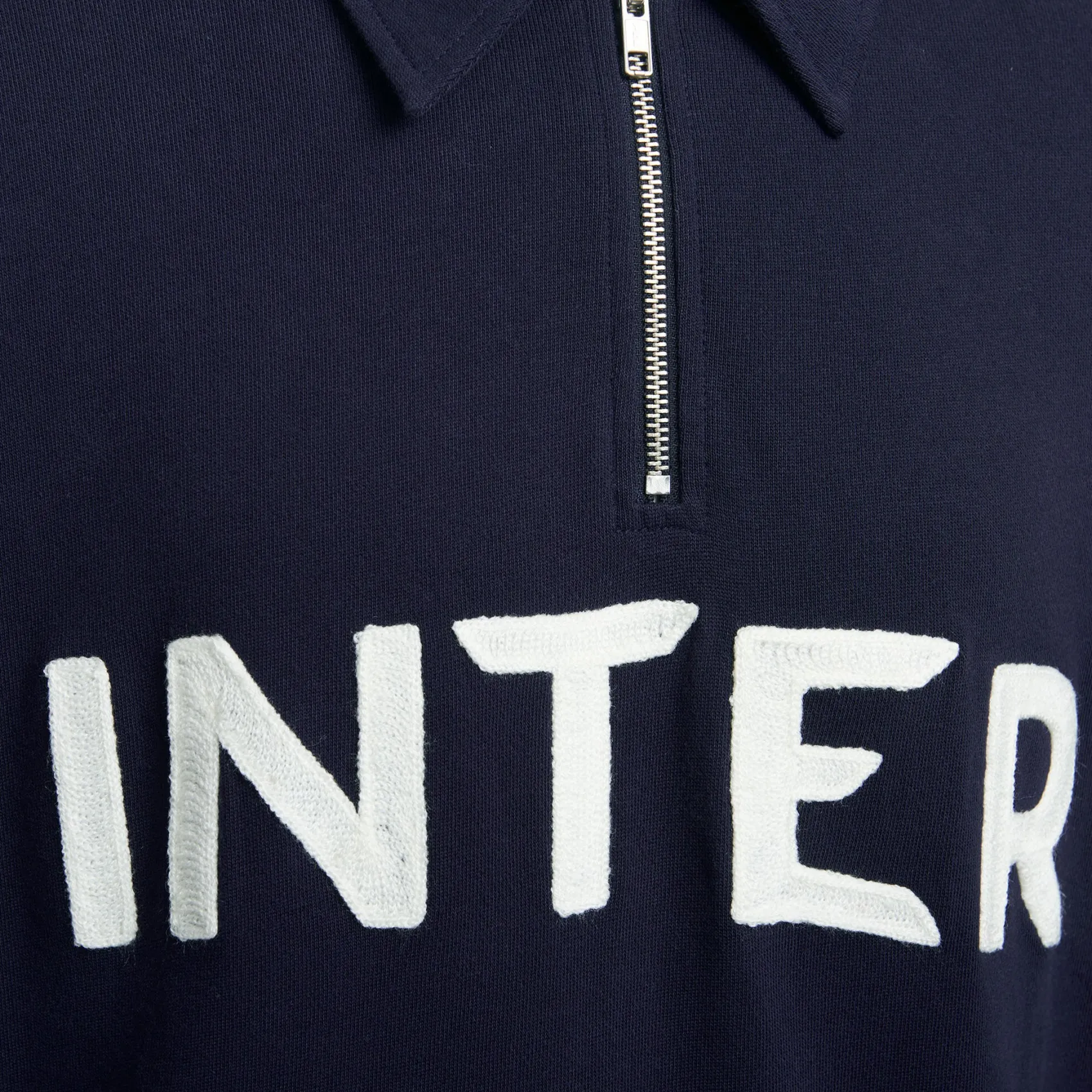 Il maglione retro del 1949 è realizzato in 100% cotone. Presenta un colletto a polo e zip a un quarto. La scritta INTER è realizzata con una particolare tecnica di ricamo vecchio stile.