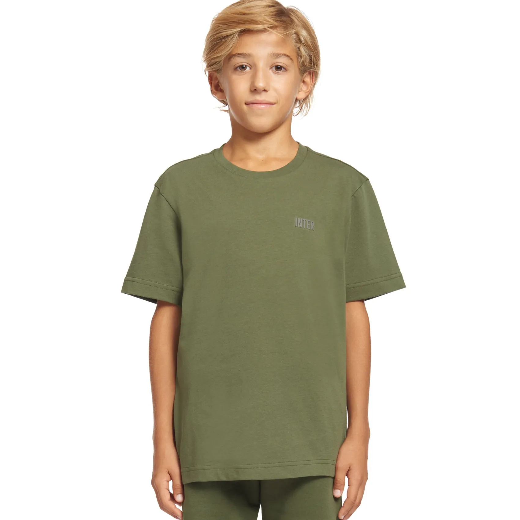 T-shirt INTER manica corta in cotone con collo in costina. Stampa gommata 3D con scritta INTER posizionata sul taschino. Logo INTER gommato 3D sul retro. Vestibilità regolare.