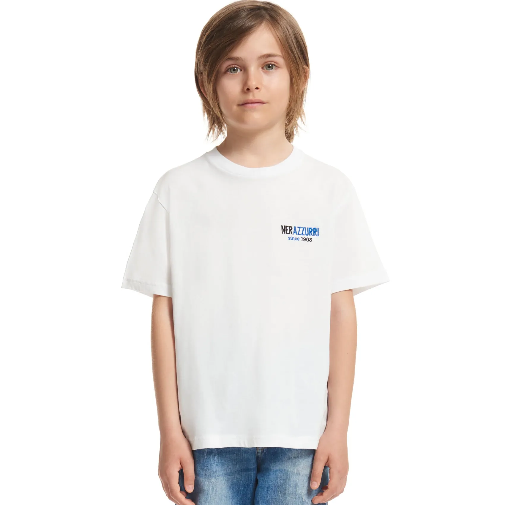 T-shirt INTER bambino manica corta in cotone, personalizzata con ricamo nerazzurri. Vestibilità regolare.