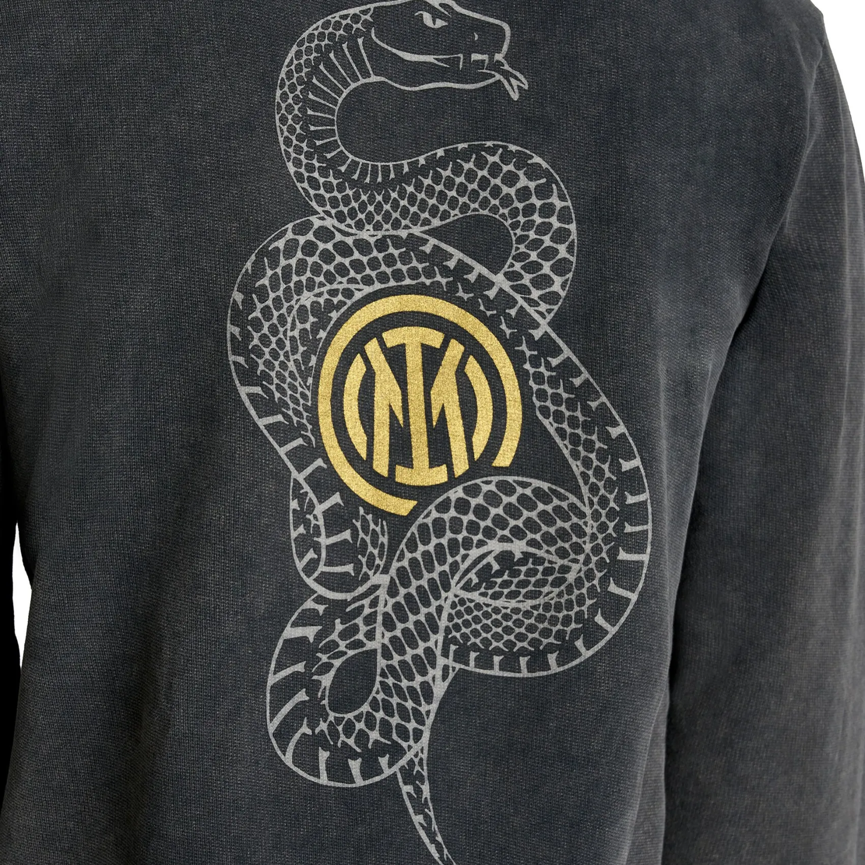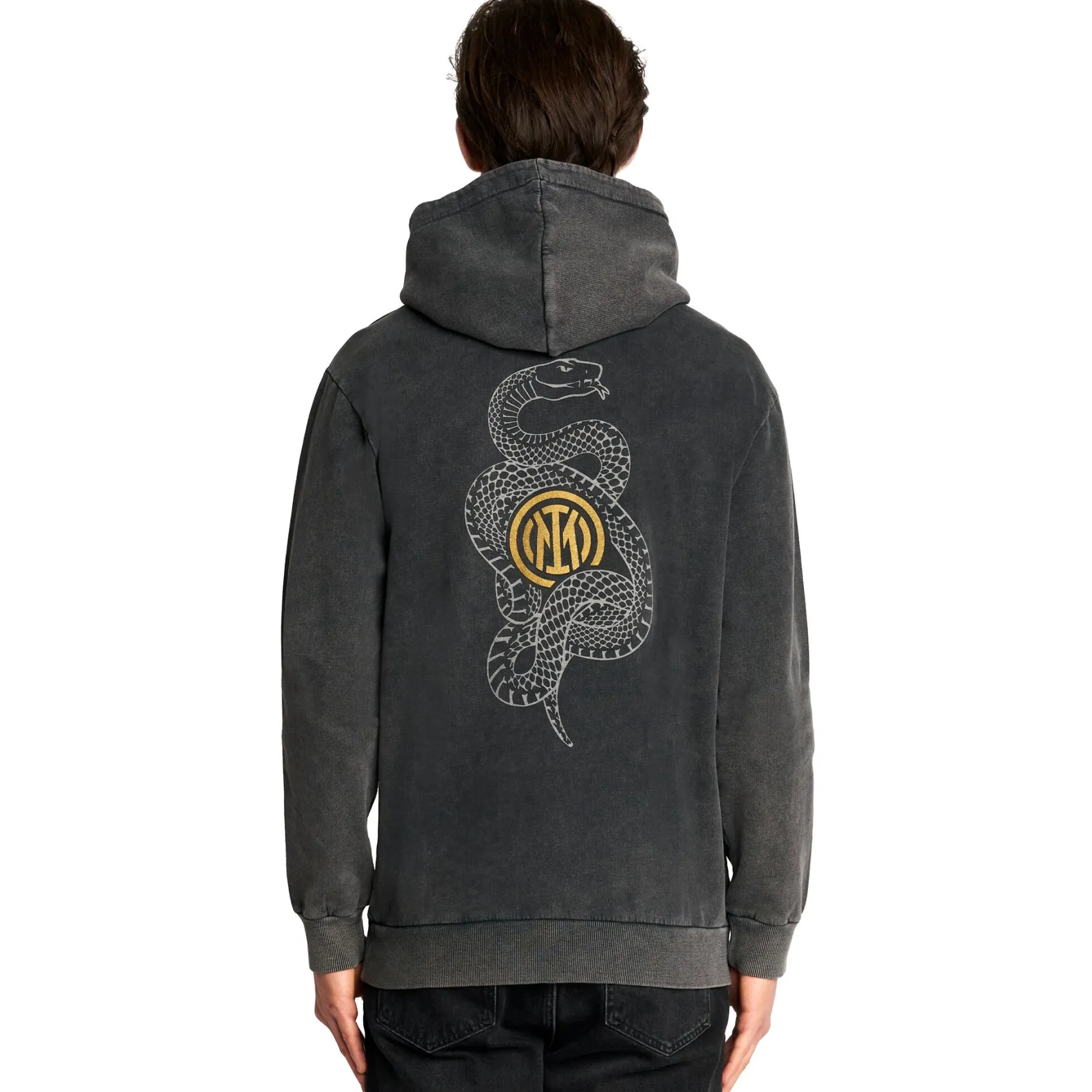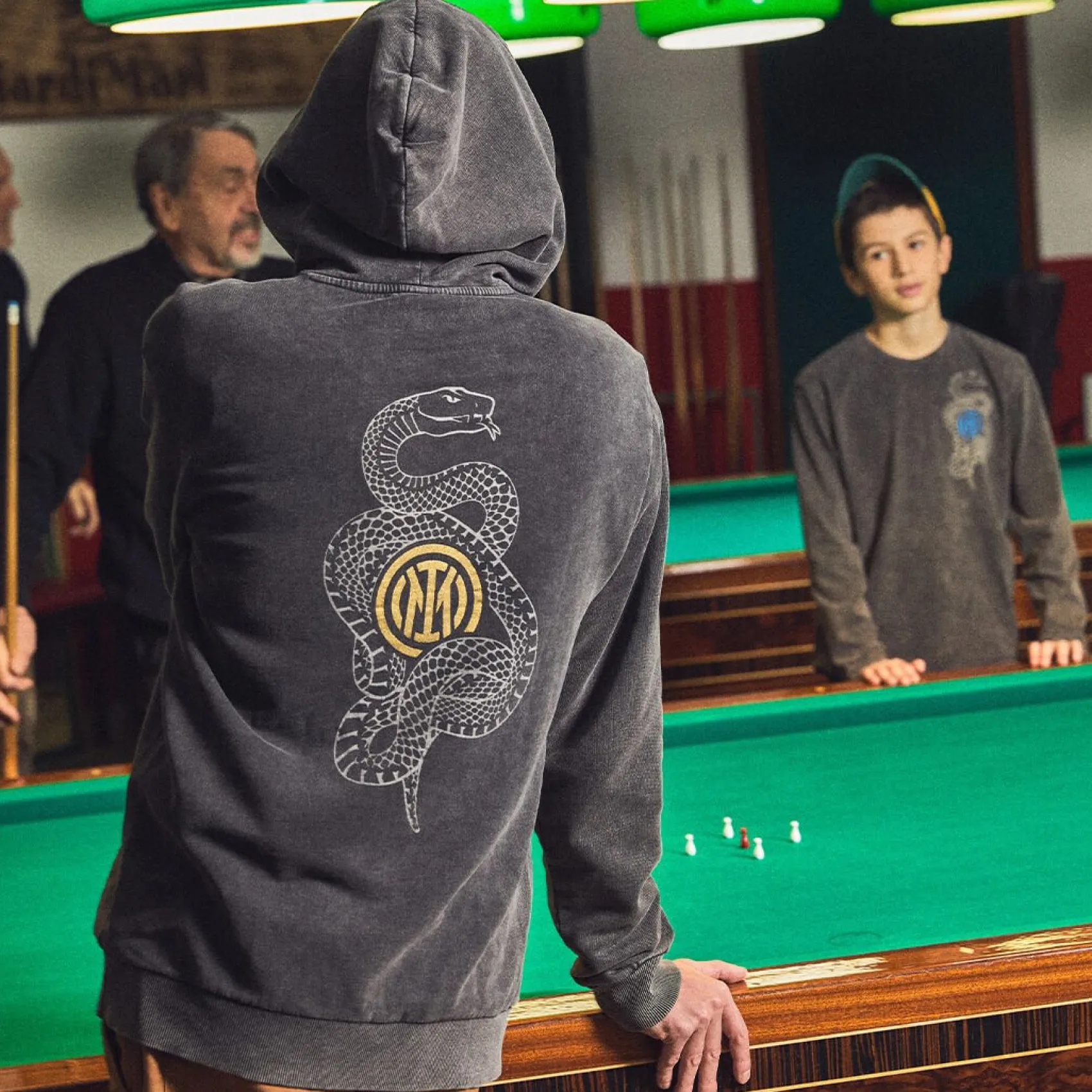 La felpa con cappuccio Snake Club INTER, in morbida base cotoniera, è caratterizzata da un effetto marmorizzato che dona una particolare morbidezza al tatto. La qualità dei tessuti e la ricercatezza dei trattamenti la rendono un prodotto premium ed esclusivo, unico nella nostra gamma prodotti. La felpa è personalizzata dalla stampa del biscione che si intreccia intorno al logo del club sul retro e dalla scritta INTER sul davanti. Vestibilità regolare.