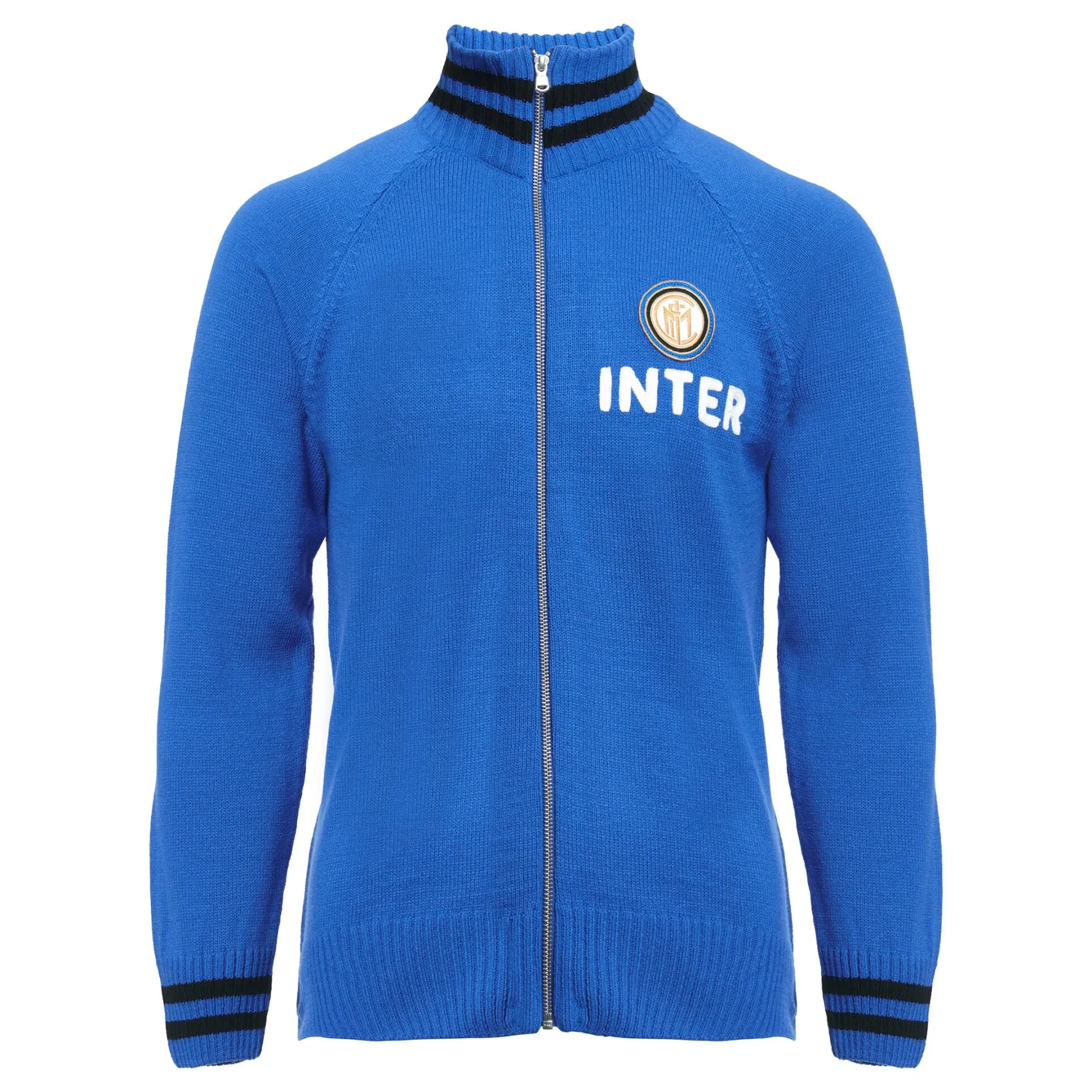 La giacca retro 1960/68 è realizzata in 100% acrilico. La giacca è dotata di colletto alto. Lo stemma e la scritta INTER sono ricamati in stile olandese.