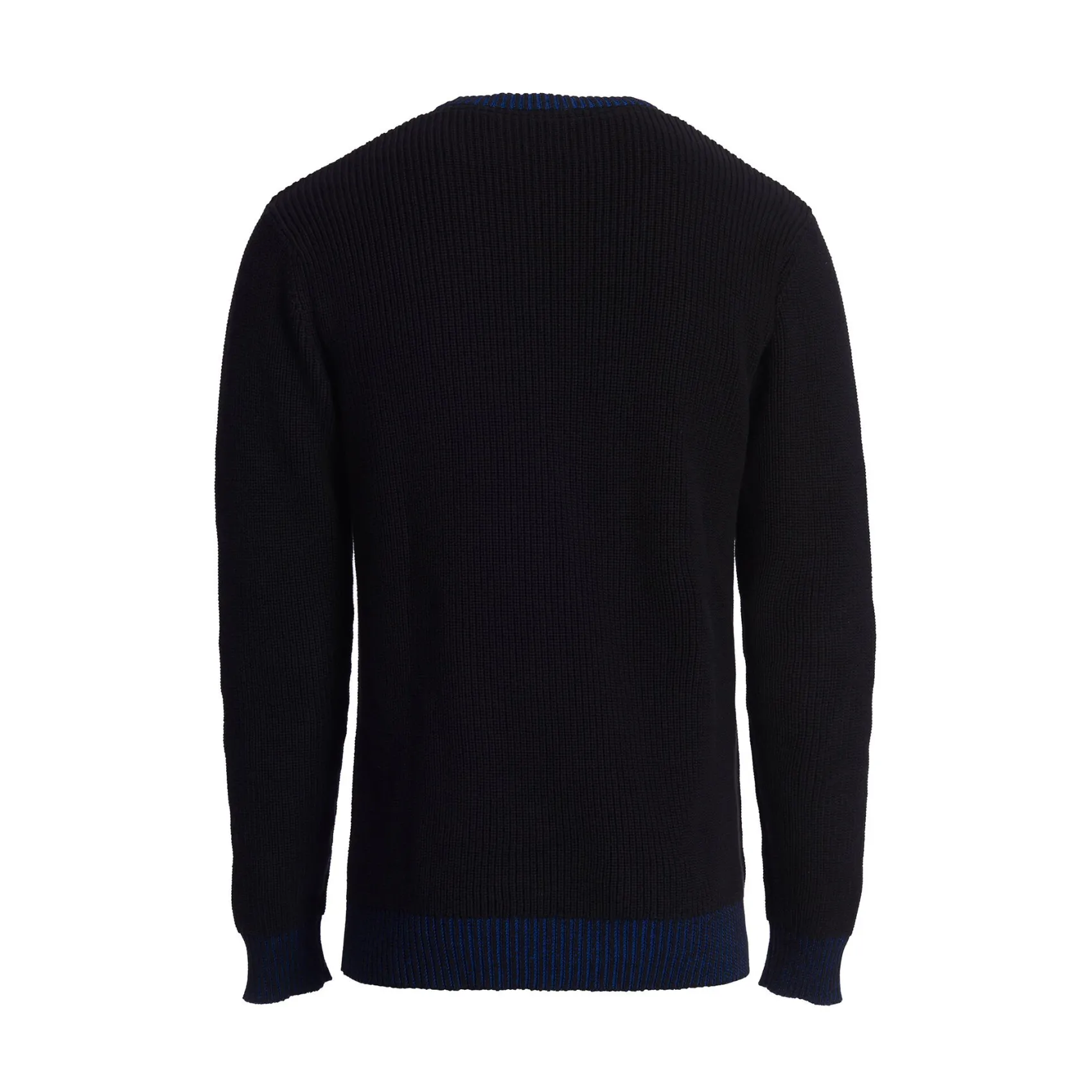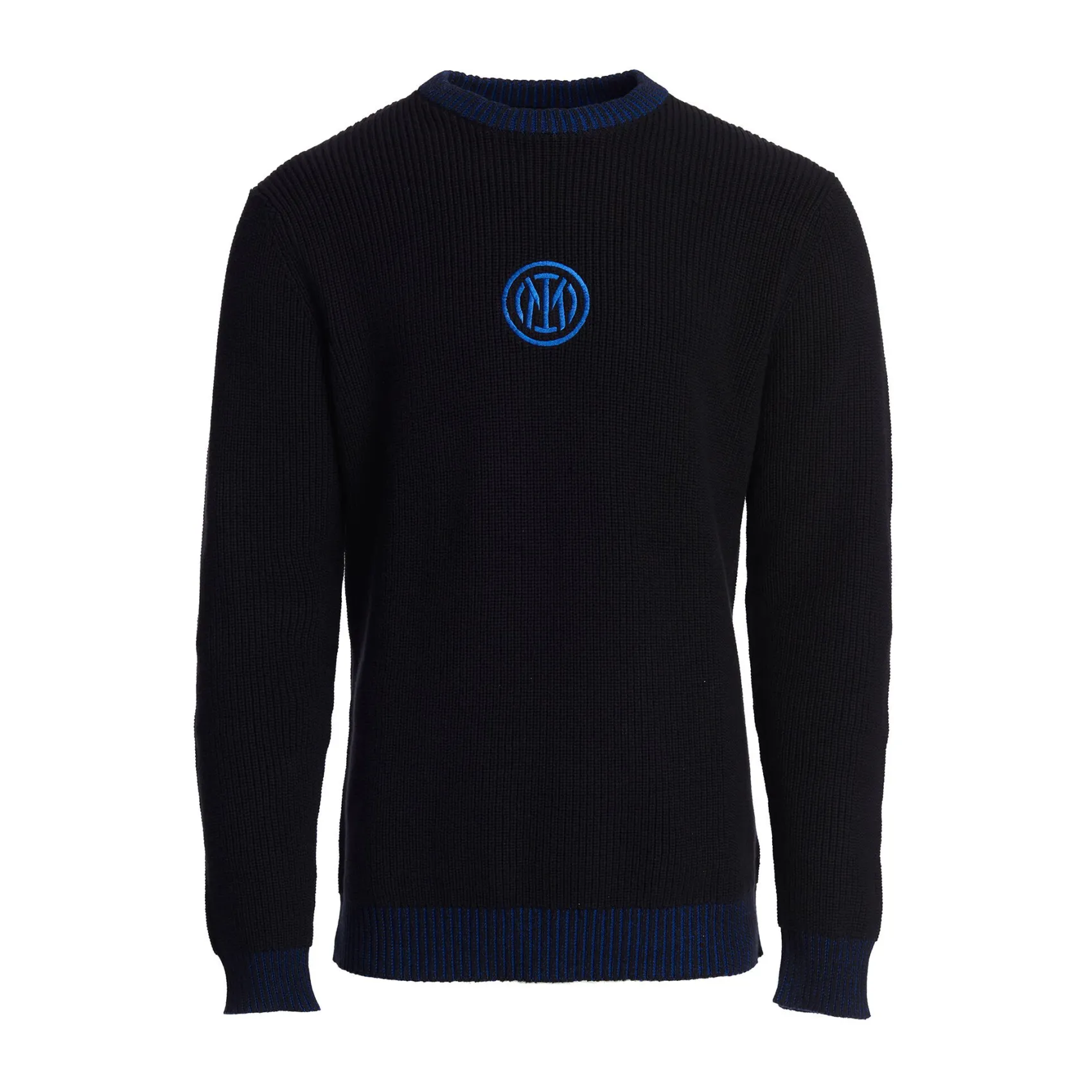 Il maglione INTER è realizzato in morbida costina 100% cotone. Girocollo dalla mano morbida, collo, polsi e fondo in costina nerazzurra. Personalizzato con logo del club ricamato al centro. Vestibilità regolare.