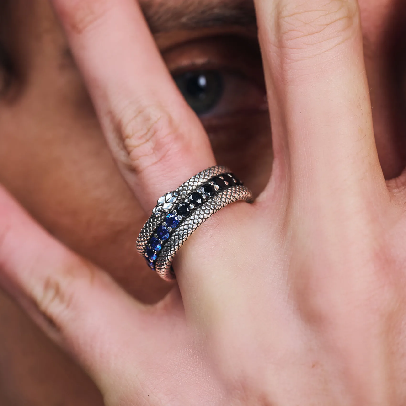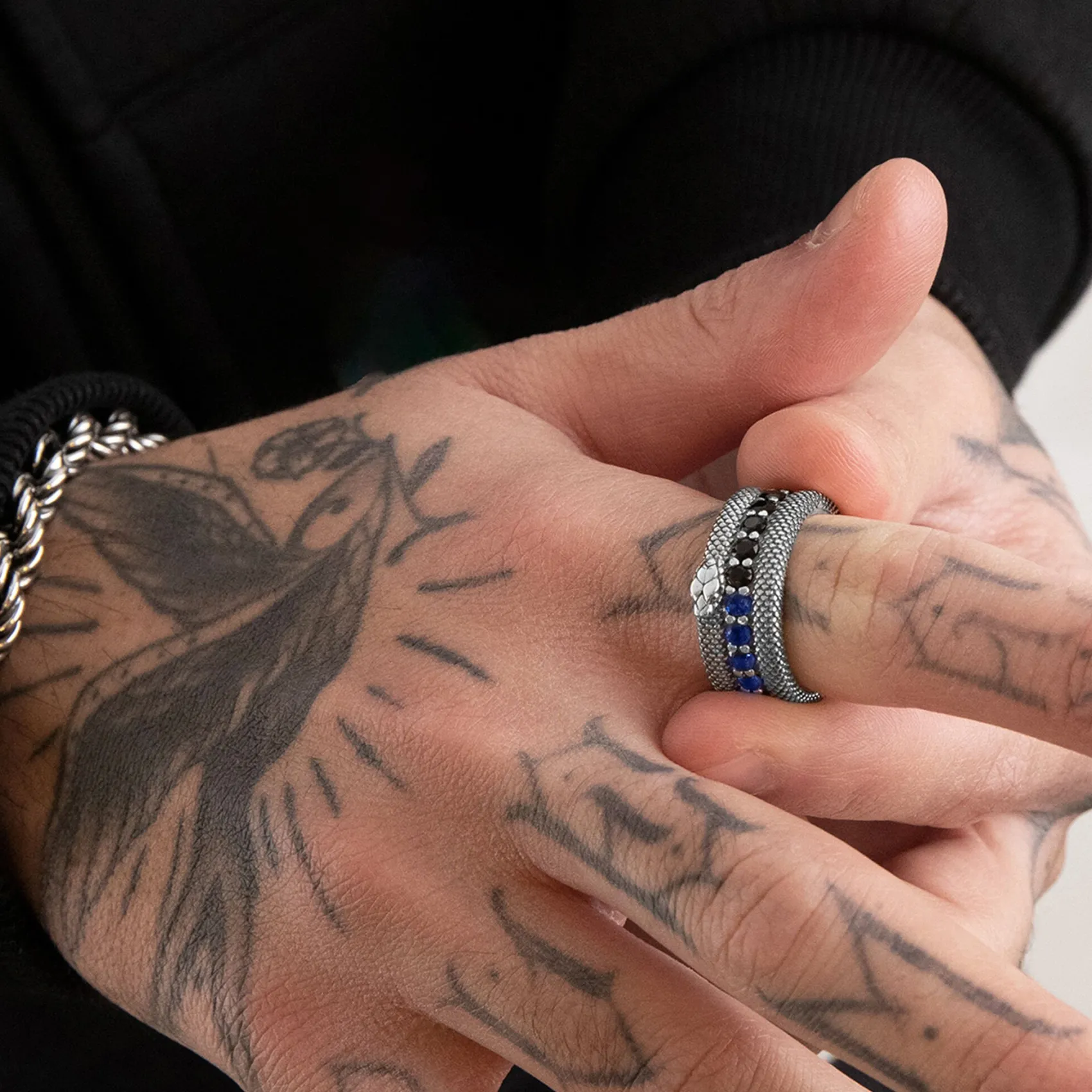 La collezione INTER X NOVE25 celebra l’unione del Club nerazzurro con l’azienda milanese nota per la realizzazione di gioielli in argento. L’anello dal pattern squamato, che si ispira al simbolo del club, richiama i colori della bandiera con le sue pietre nere e azzurre, in un elegante connubio di tifo e stile.
