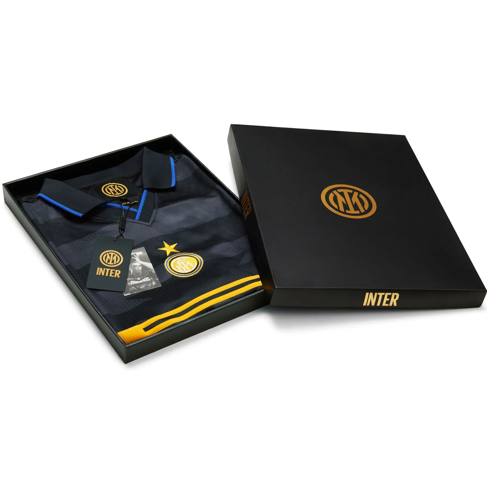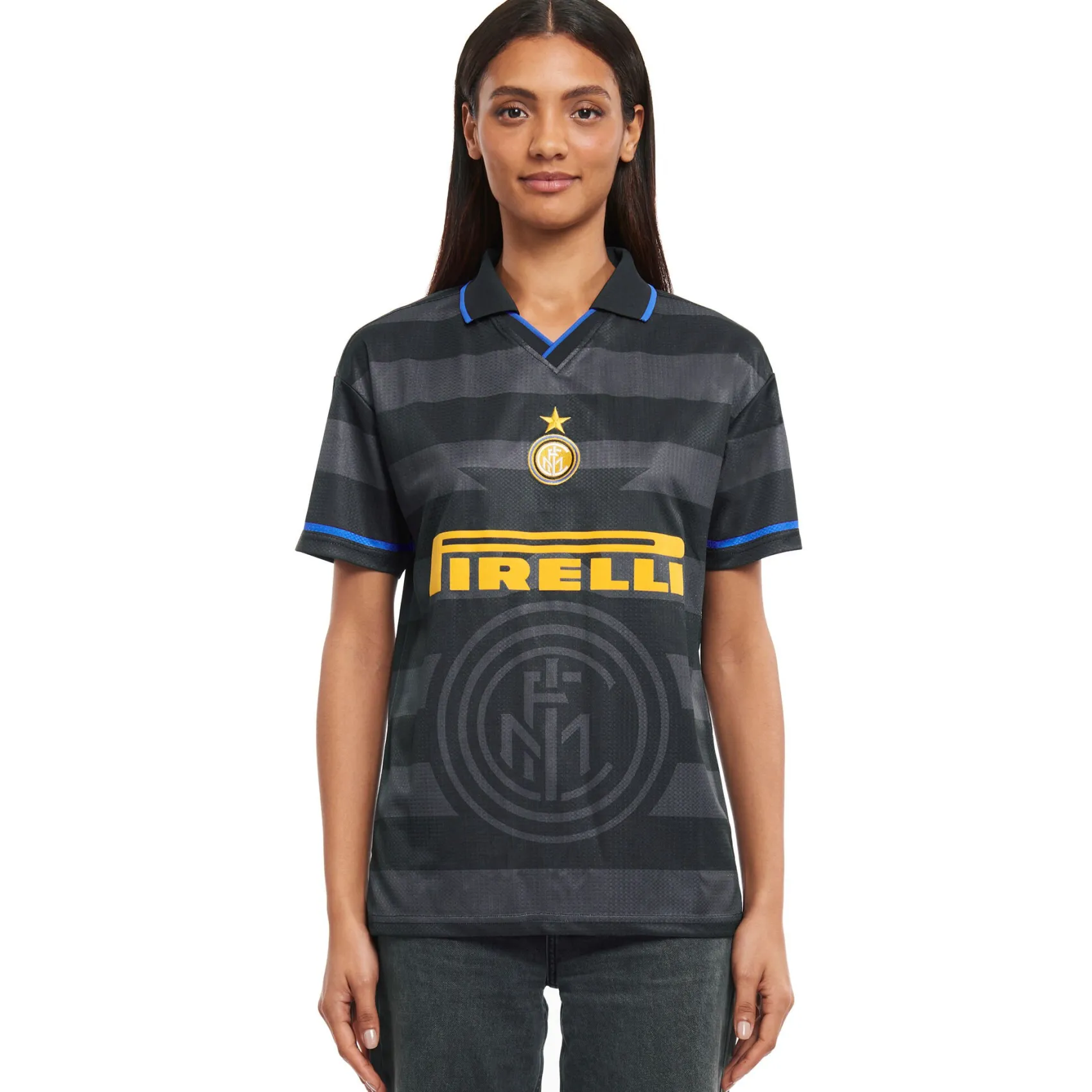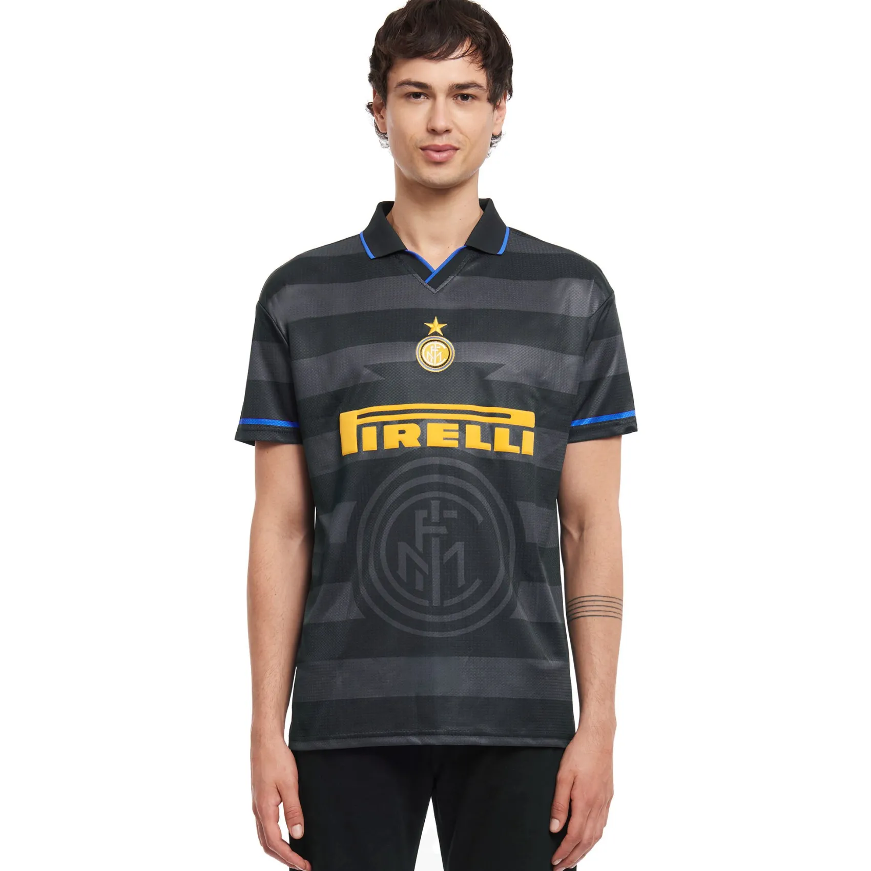 La maglia storica Third 1997/98 è realizzata in 100% poliestere riciclato in uno speciale tessuto jacquard. La maglia è a maniche corte con scollo a V e colletto a polo. Lo stemma dell’INTER è ricamato, la stampa dello sponsor è in rilievo.